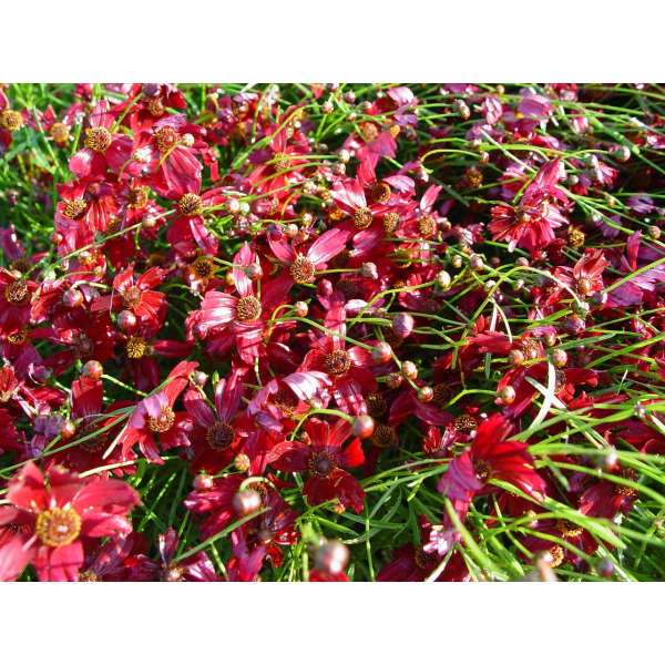 Coreopsis verticillata 'Ruby Red' is een compacte, heuvelvormende vaste plant met fijn verdeeld, donkergroen blad.