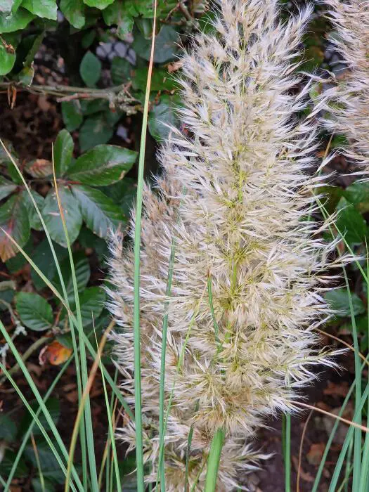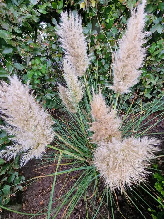 Cortaderia selloana 'Golden Goblin' is een compacte vorm met goudbonte bladeren en dikke roomwitte bloeipluimen, mooi in een grote vaas binnenshuis.