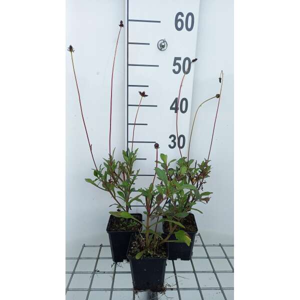Vormt een rechtopstaande plant met roodbruine stengels en donkergroene geveerde bladeren.