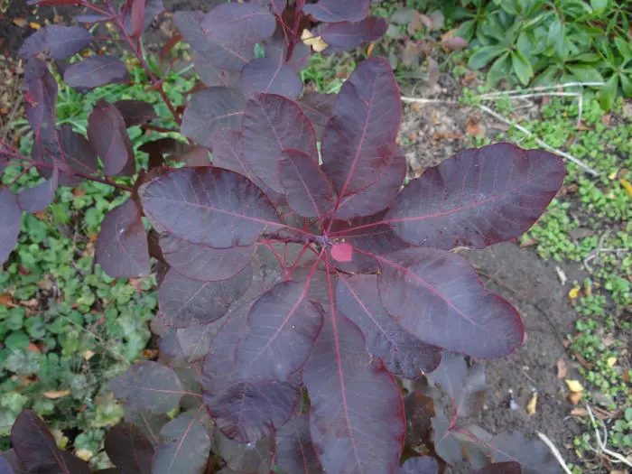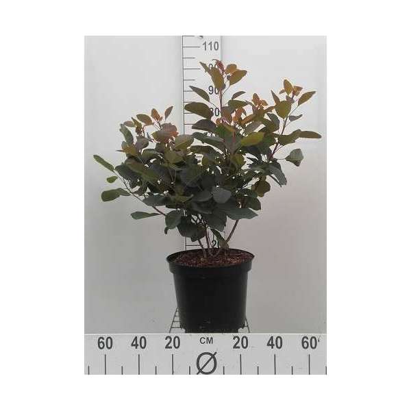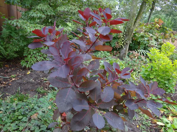 Het is een aantrekkelijke struik/kleine boom met ronde bladeren die wijnrood uitlopen verkleurend naar donker roodblauw in de zomer tot fel oranjerood in het najaar.