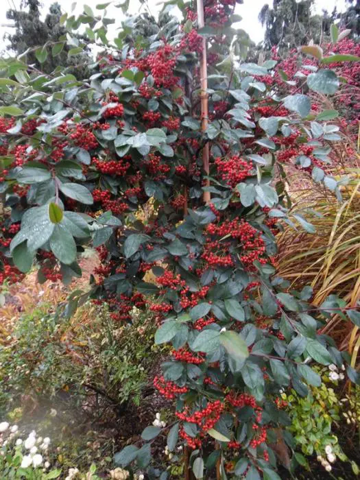 Bloeit met tuilen van witte bloempjes gevolgd door oranjerode besjes.