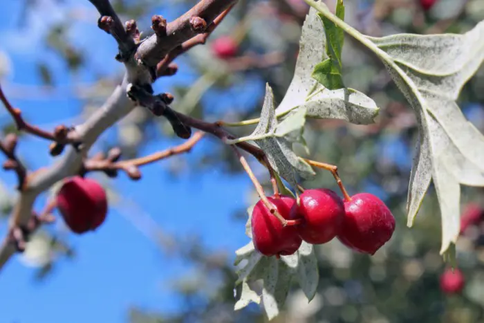 Bloeit met trossen van kleine witte bloemen met een roze blos, gevolgd door kleine donkerrode vruchten die de ganse winter aan de boom blijven.