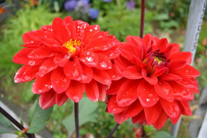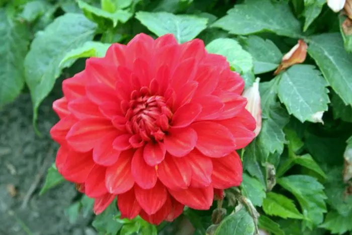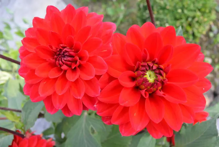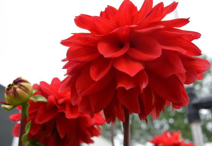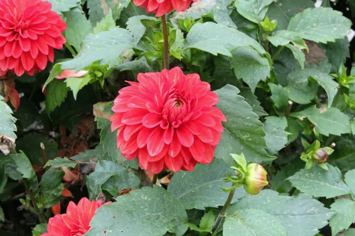 Dahlia 'Heatwave' is een decoratieve dahlia met goed gevulde zuiverrode bloemen en brede platte bloemblaadjes.