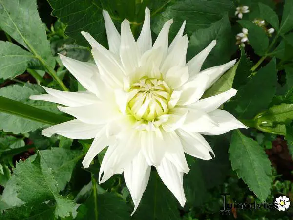 Dahlia 'My Love' is een cactusdahlia (spinnekopdahlia) met goed gevulde, zuiverwitte bloemen met een groengeel centrum. De bloemblaadjes zijn bijna volledig opgerold.