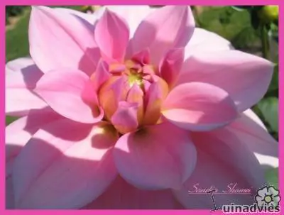 Dahlia 'Sandia Shomei' is een waterleliedahlia, lijkt op de decoratieve dahlia maar de bloem is platter van vorm. Heeft brede platte, lilaroze bloemblaadjes .