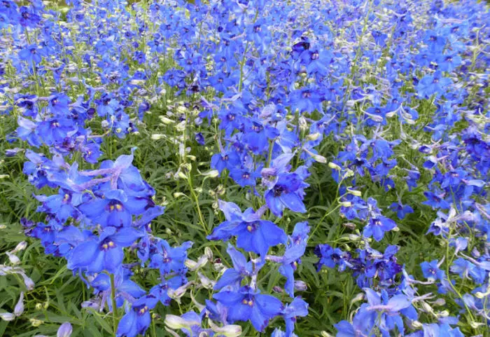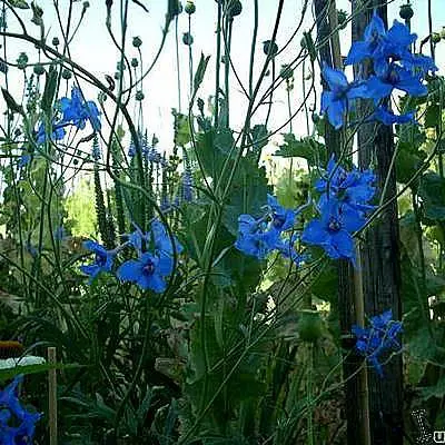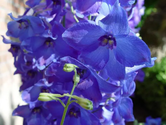 De bloemen hebben een diepblauwe kleur met een donkerder oog.