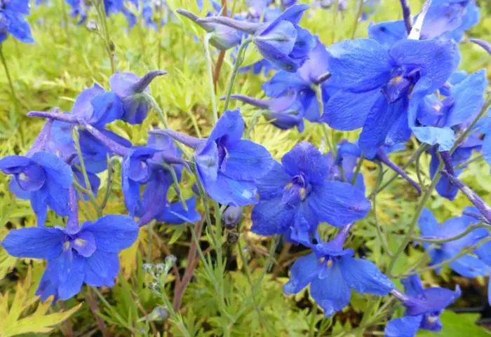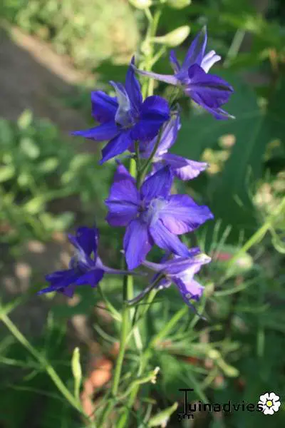 Delphinium grandiflorum 'Blauer Zwerg' bloeien met azuurblauwe bloemen en hebben een herkenbaar handvormig blad met smalle lange slippen.