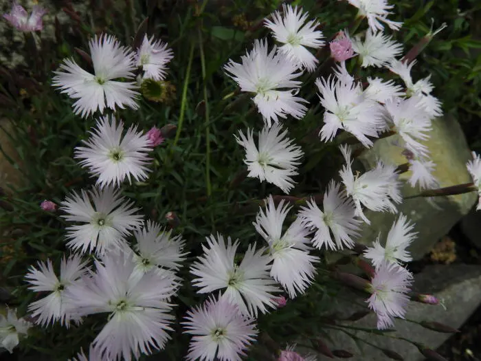 Dianthus hyssopifolius vormt dichte rozetten van zeer fijne grijsgroene bladeren en opvallende witte bloemen. Zijn licht geurig en hebben driehoekige bloemblaadjes met lange gefranjerde randen.