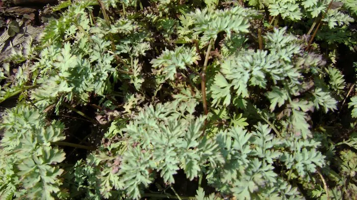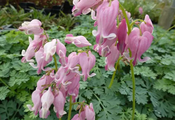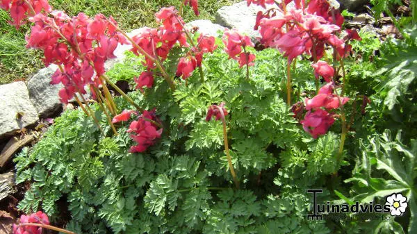 Dicentra 'King of Hearts' heeft een varenachtig grijsgroen blad met hangende trosjes van fuchsiaroze buisvormige bloemen.