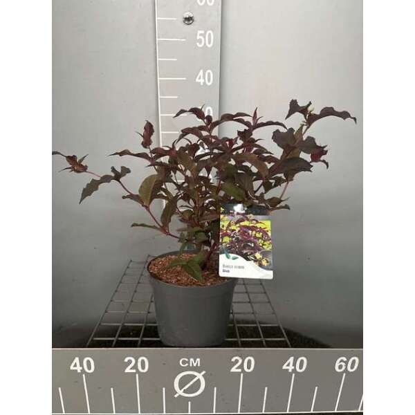De bladeren zijn donkerrood, lancetvormig ovaal. In het najaar is de rode kleur nog intenser.