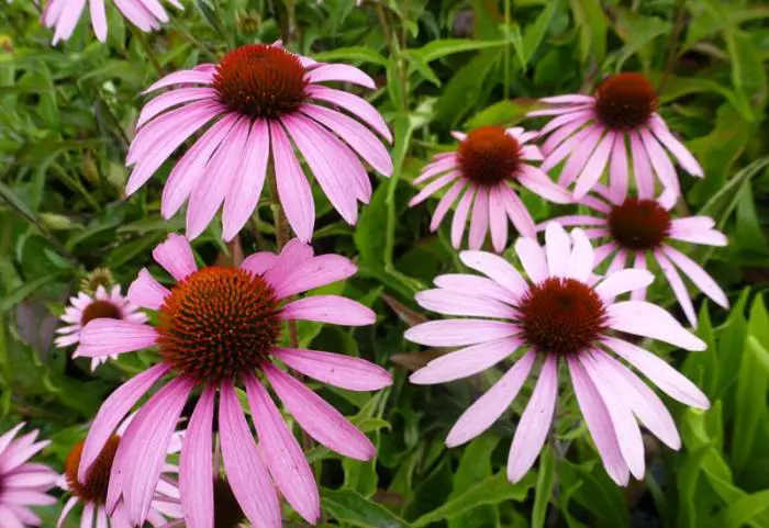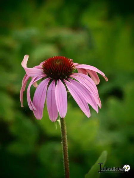 Echinacea purpurea 'Baby Swan Pink' is een compacte cultivar met roze bloemen met in het centrum een oranjebruine kegel.