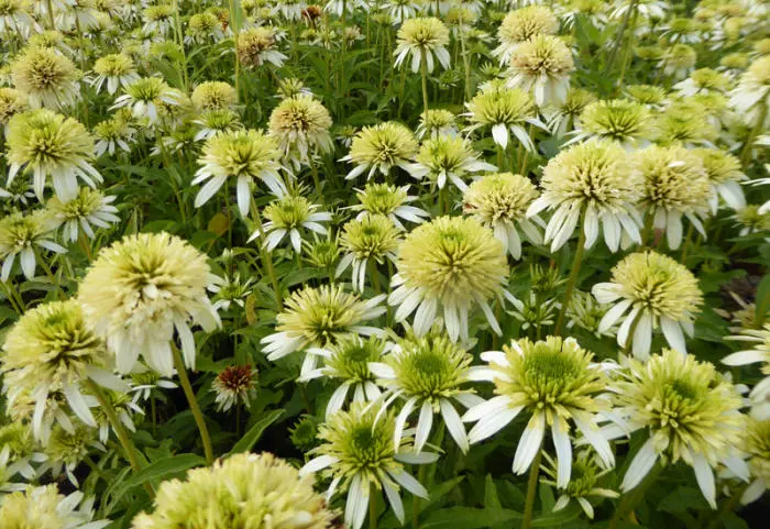 Echinacea purpurea 'Meringue' bloeit met cremegele/witte dubbele bloem.