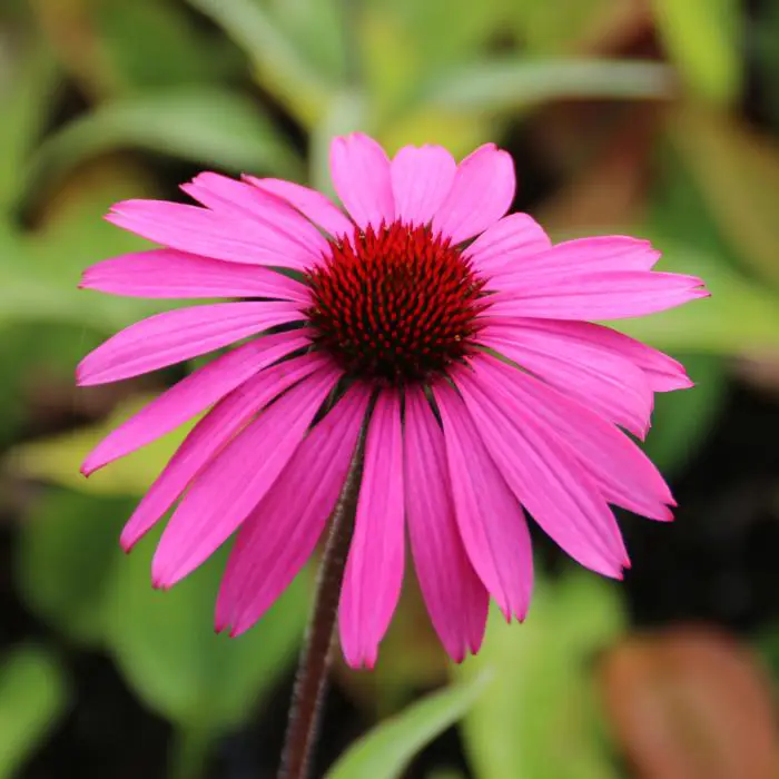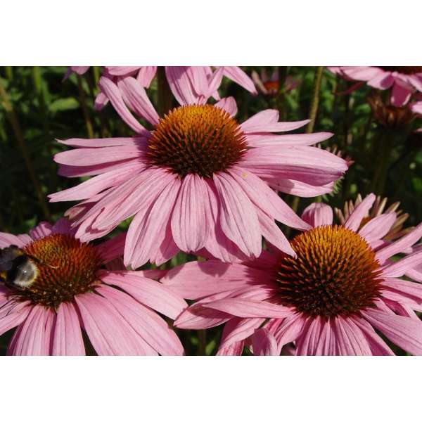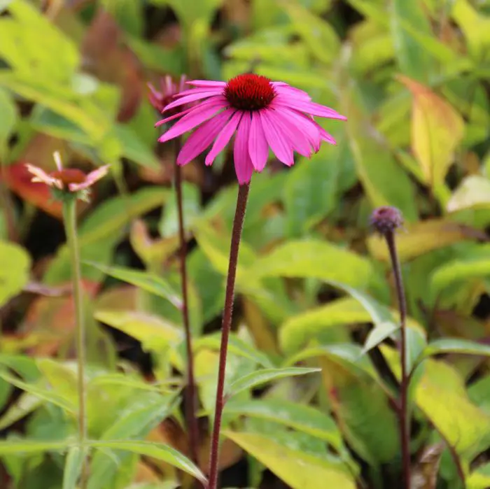 Echinacea purpurea 'Primadonna Deep Rose' bloeien met grote rozemagenta bloemblaadjes rond een hoger verheven oranje grote knop.