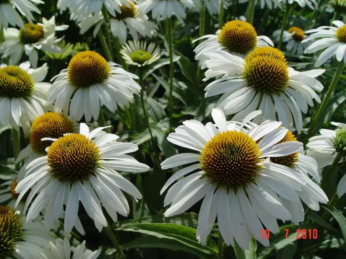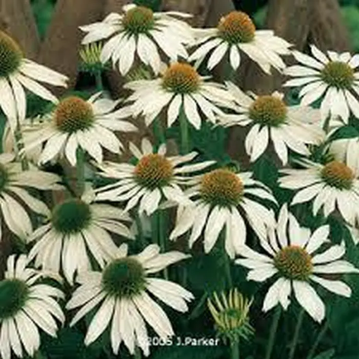 Echinacea purpurea 'Primadonna White' bloeien met grote witte bloemblaadjes rond een hoger verheven oranje grote knop.