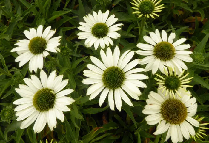 Echinacea SUNSEEKERS 'White' bloeit met enkelvoudige witte bloemen.