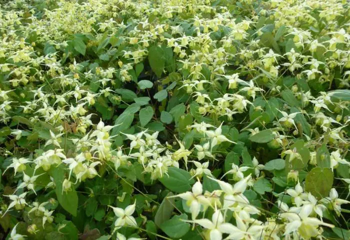 Epimedium Flower of Sulphur' is een hybride van E. flavum en E. ogisui.