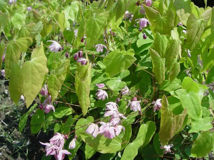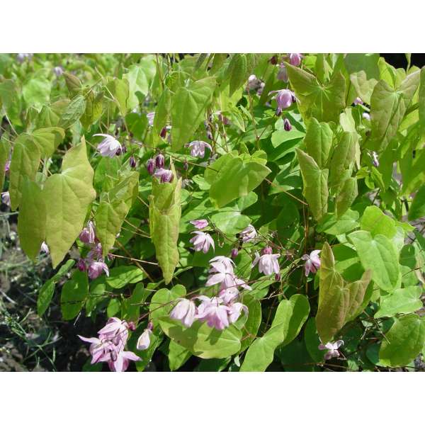 Epimedium 'Sasaki' heedt frisgroen blad en bloeit aan lange slanke stelen lilaroze bloemen.