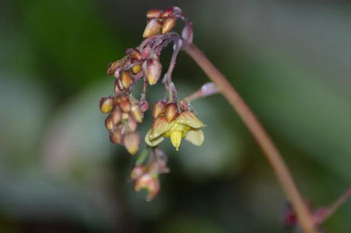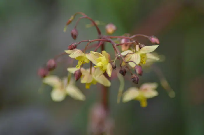 Epimedium pinnatum 'Black Sea' bloeit met rozig ambergele bloemen.