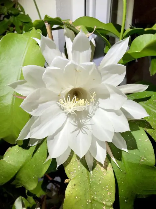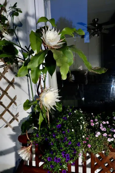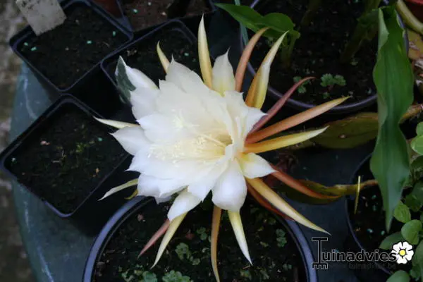 Deze schoonheid, soms koningin van de nacht genoemd, bloeit maar enkele uren, van het vallen van de avond tot de morgen, gelukkig staan er meestal 10 tot 20 bloemknoppen aan de plant.