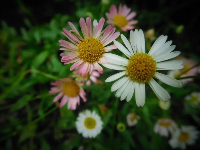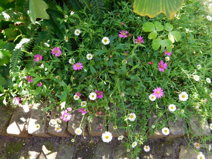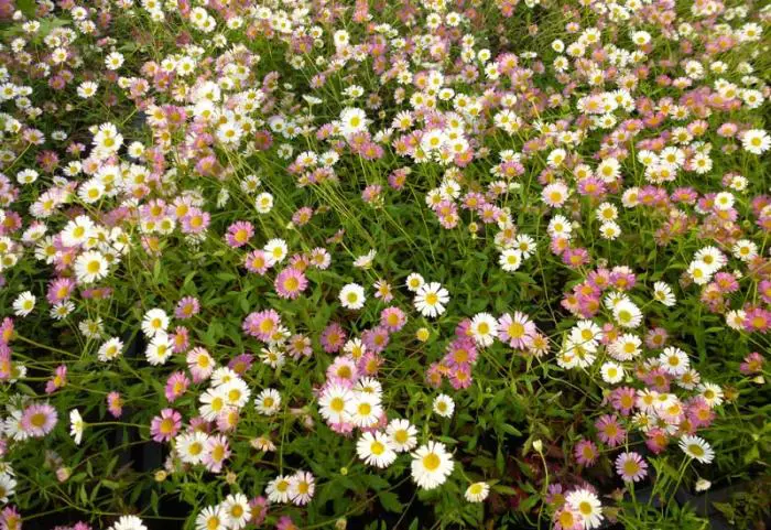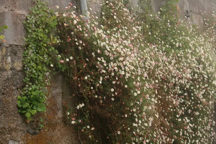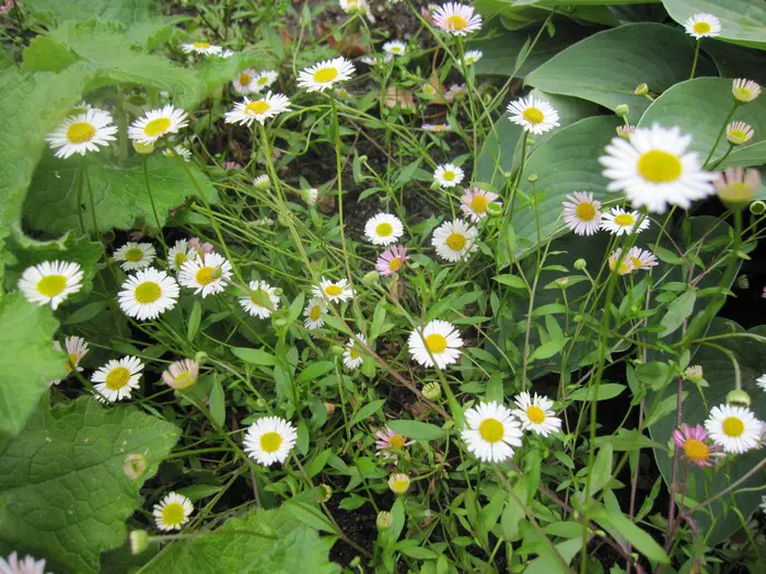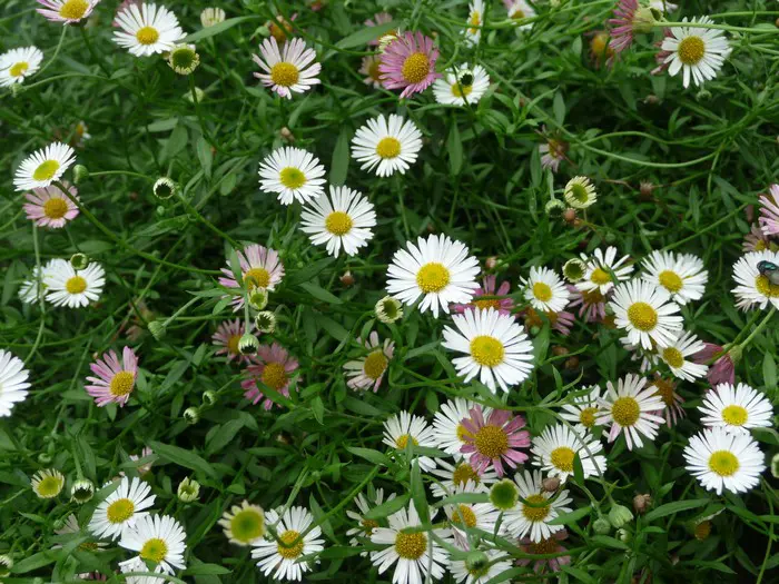 Erigeron karvinskianus is een kleine vaste plant die zich min of meer uitspreid en bloeit met een groot aantal kleine witte bloemen met een geel hart en een paarsroze onderkant.