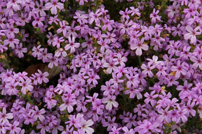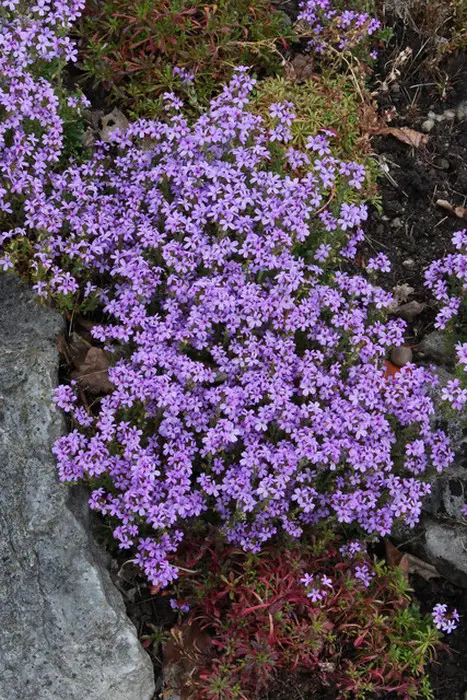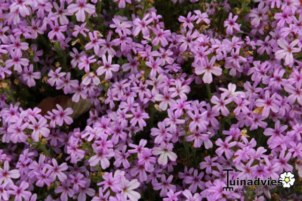 Bloeit aan korte stelen met trosjes van paarsroze stervormige bloempjes.