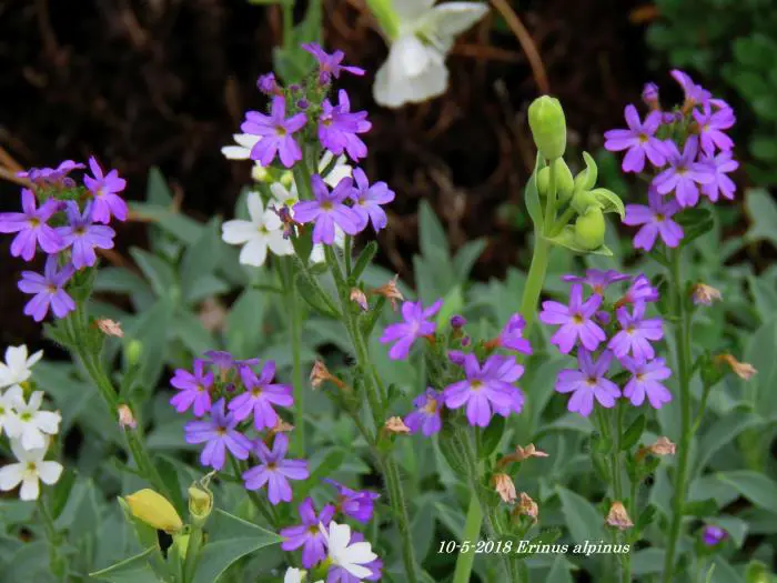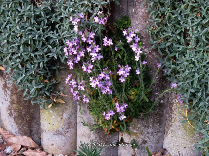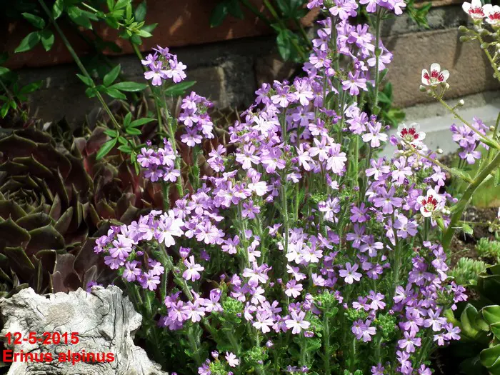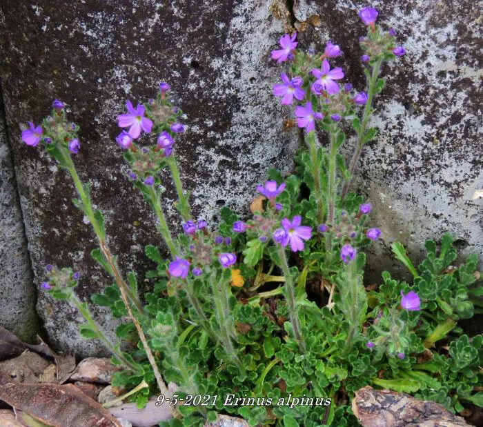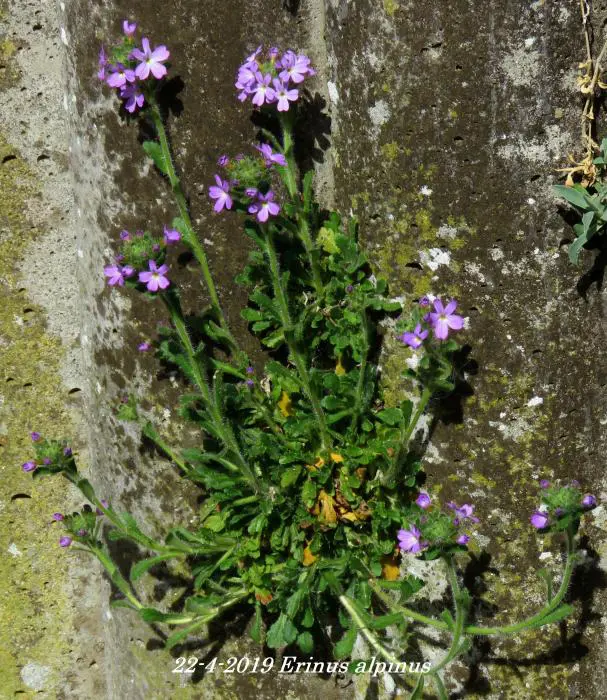 Erinus alpinus is een kleine alpenplant dat een laag kussen vormt met groene bladeren.