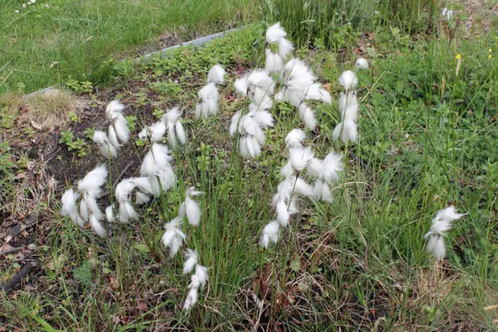 Heeft witte wollige pluimen en grasachtig lang blad.