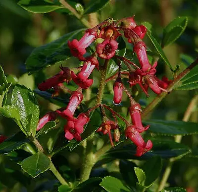Escallonia 'Crimson Sentry' is een breedbladige variëteit met glanzende donkergroene bladeren en trosjes van helder paarsrode bloempjes.