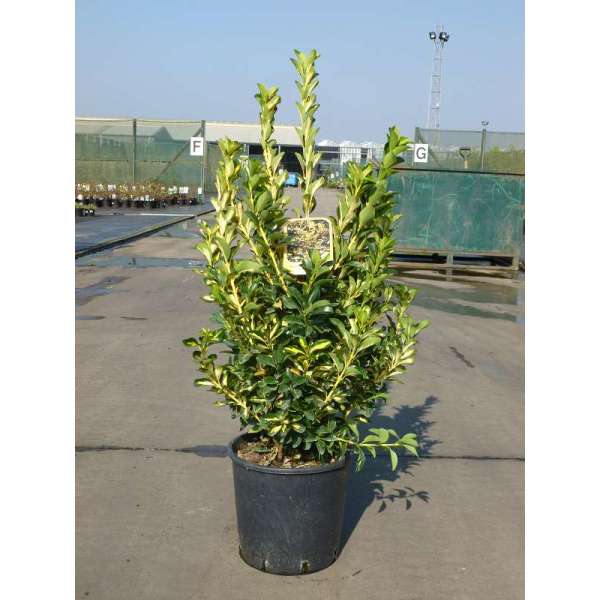 Euonymus japonicus 'Aureus' vormt een opgaande bossige struik van glanzende leerachtige bladeren, goen met een goudgeel centrum.