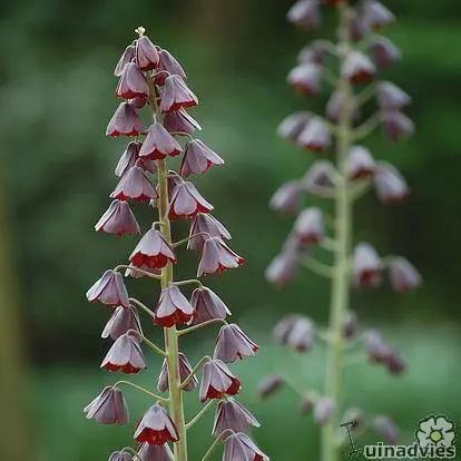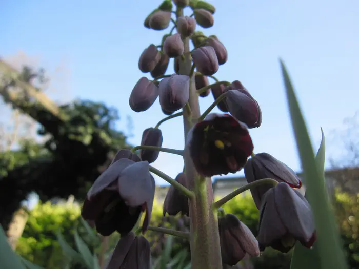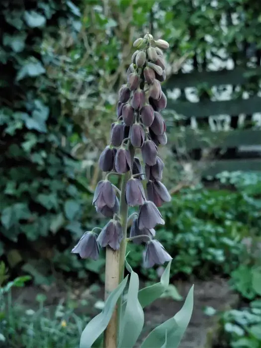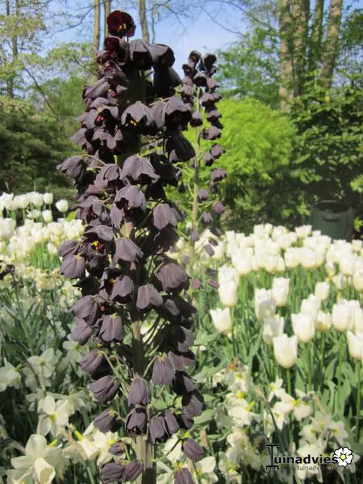 Deze kievitsbloem of keizerskroon is een winterharde bolgewas met zwartpaarse klokken en wordt zo'n 90cm hoog.
