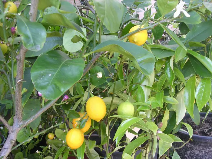 Citrus limon vormt een grote struik met grote bladeren en (paarsachtig) roomwitte bloei, gevolgd door de gele citroenen.
