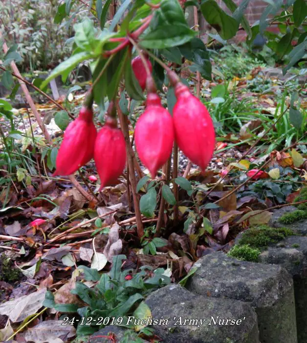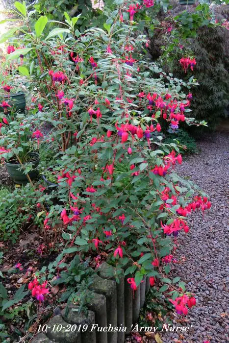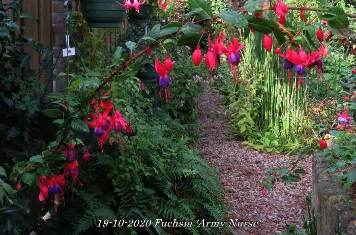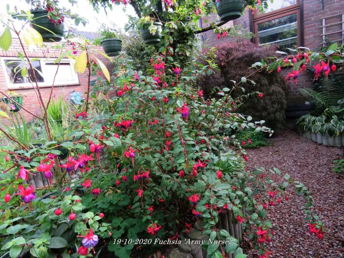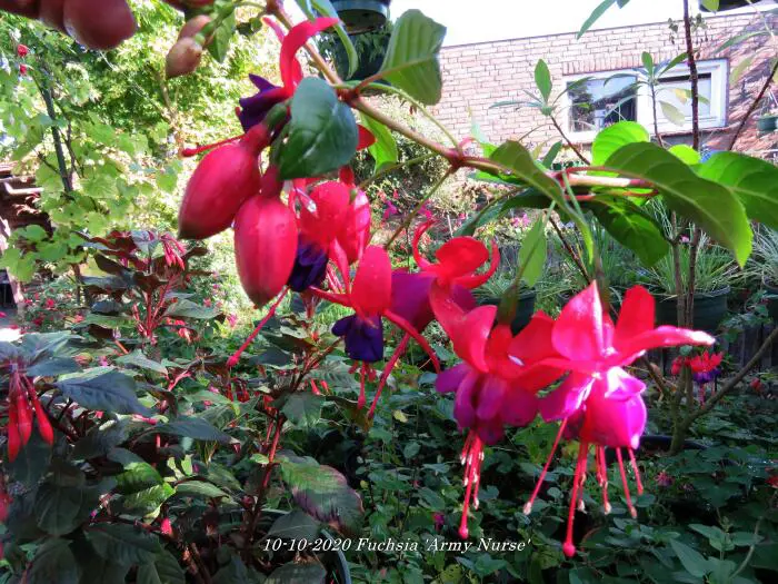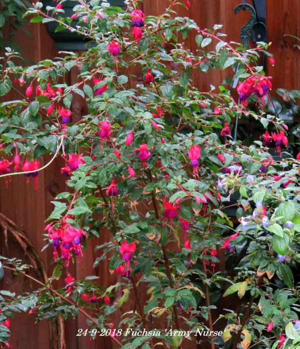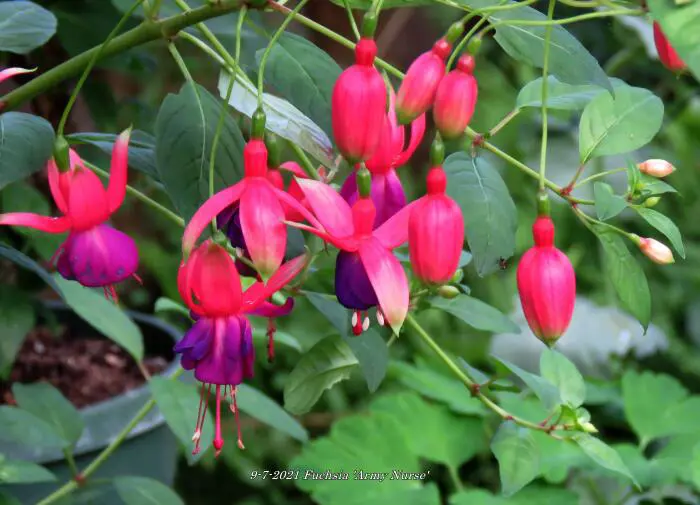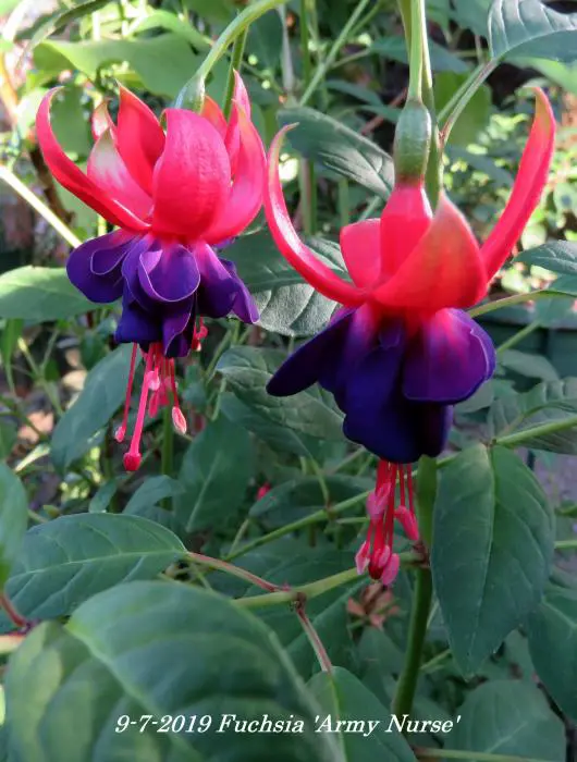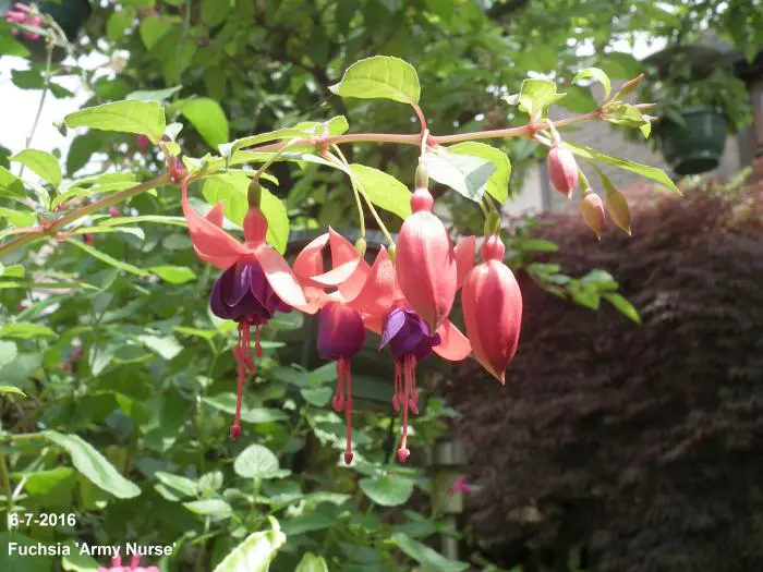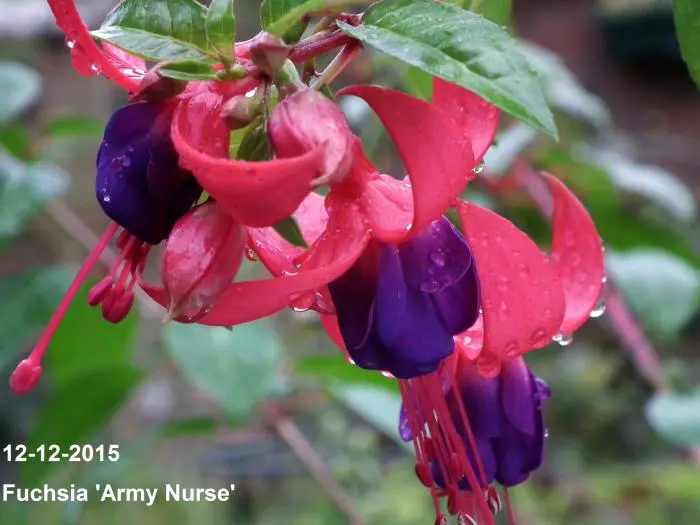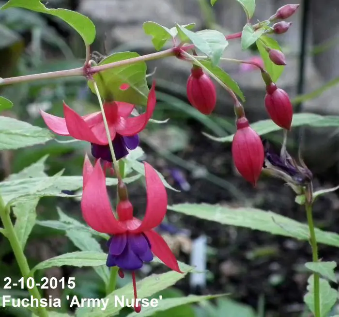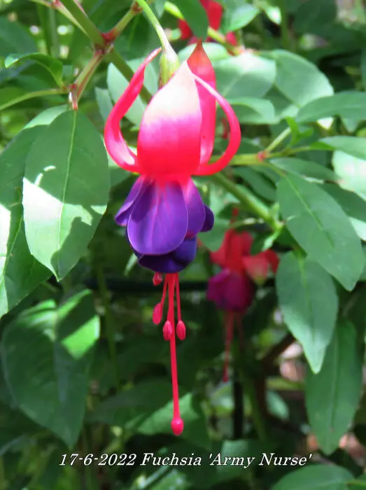 Fuchsia 'Army Nurse' is een opgaande bellenplant met semi-dubbele bloemen, karmijnrode kelk met een violetkleurige kroon.