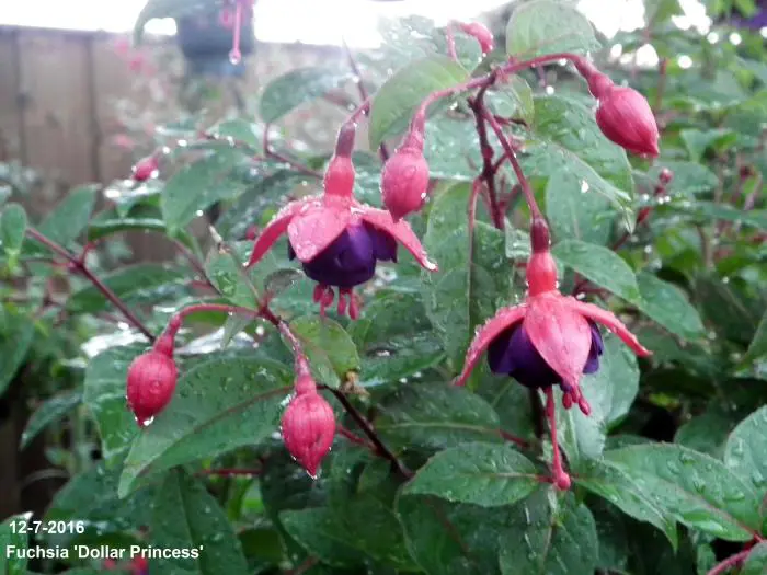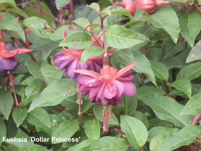 Fuchsia 'Dollar Princess' is een rechtop groeiende plant met hangende dubbele bloemen.