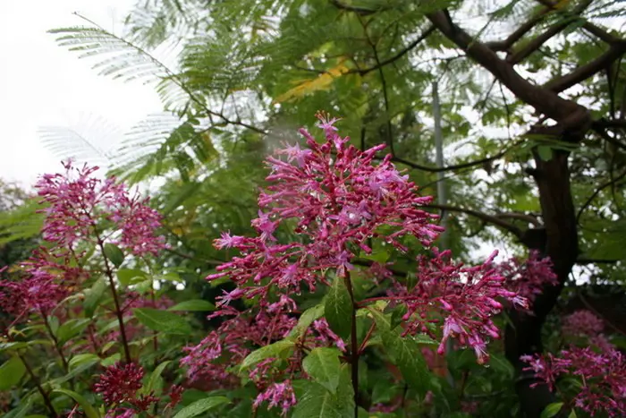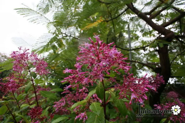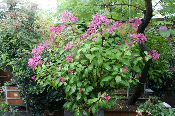 De bloei is een tros van rozerode knoppen die paarsroze open bloeien.