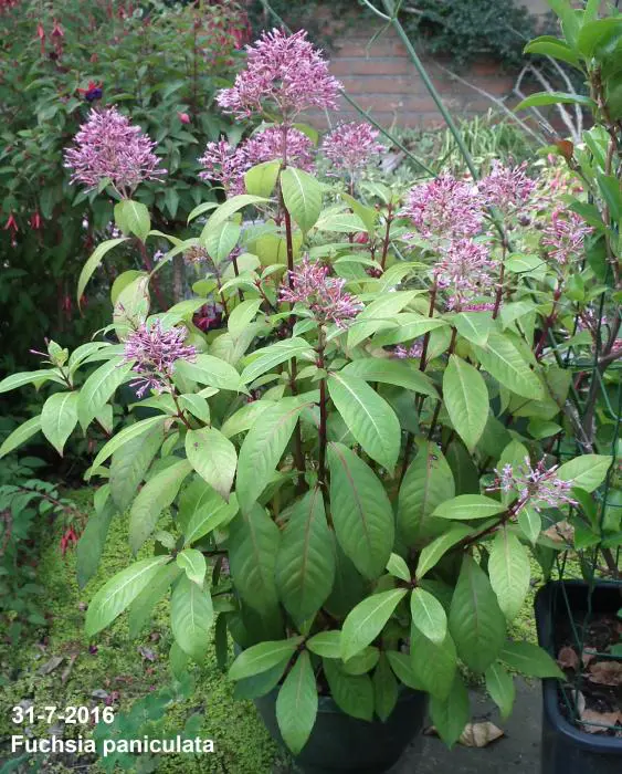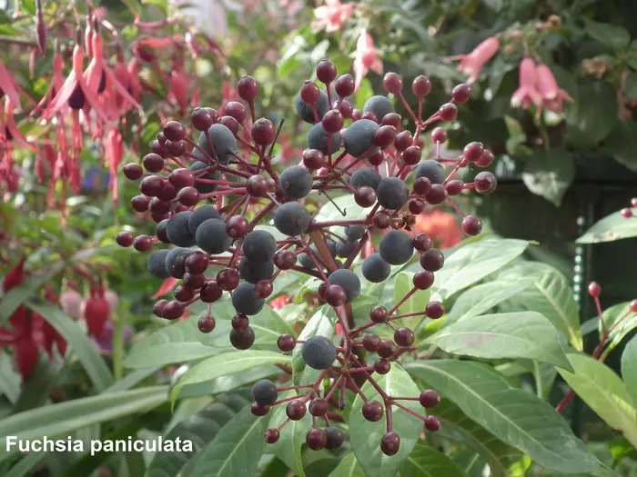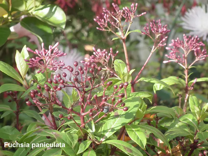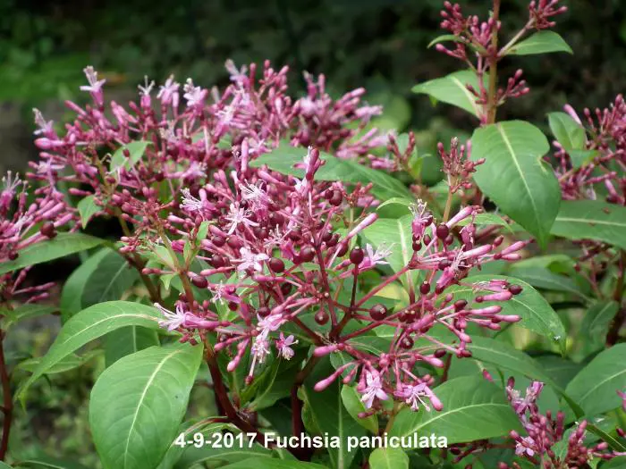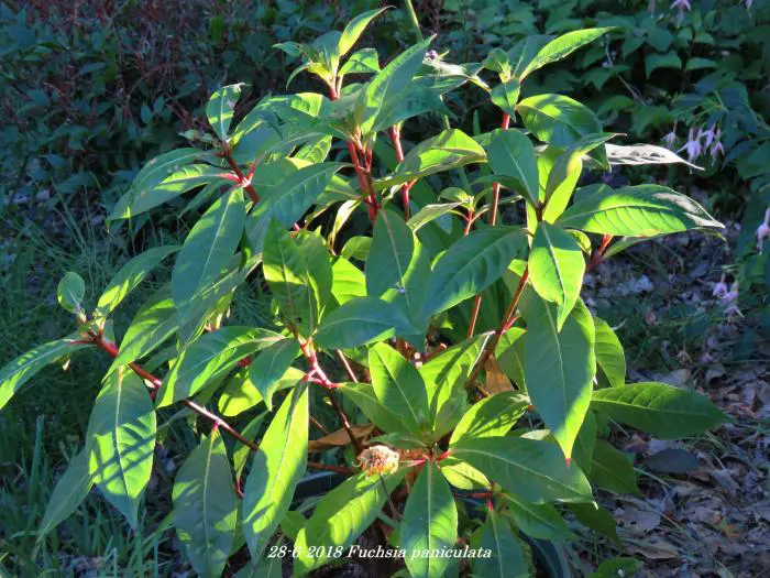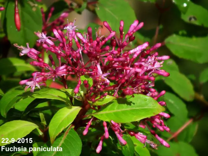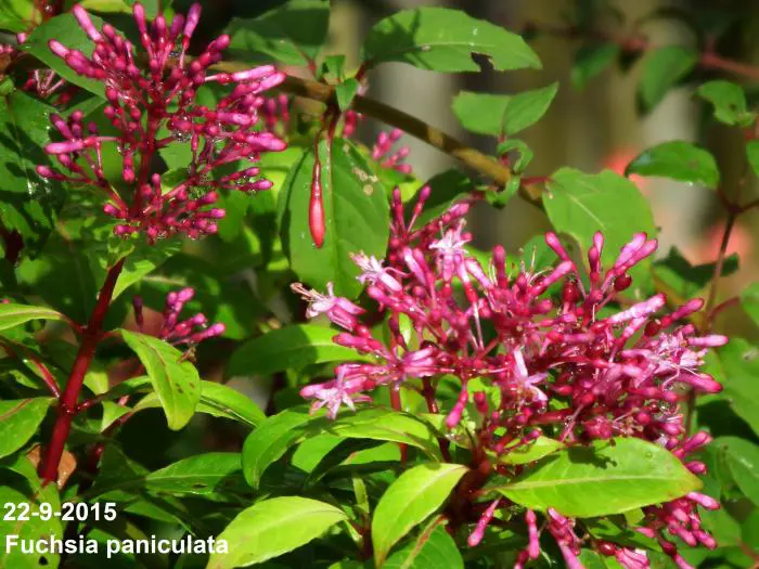 Fuchsia paniculata uit Centraal-Amerika, is een zeer rijkbloeiende struik , breed opgaand met glanzend groen langwerpige bladeren en rode stengels. Het is een botanische soort en lijkt helemaal niet op de Fuchsia die we normaal kennen.