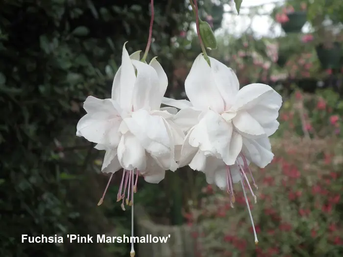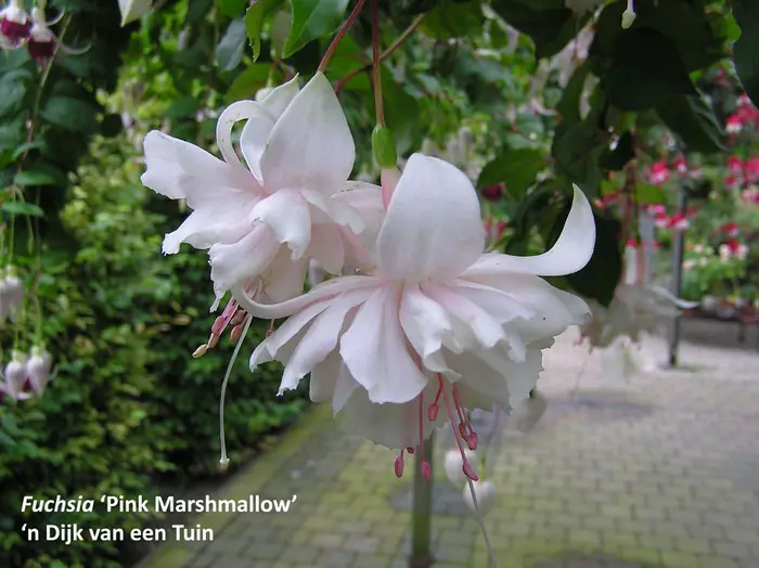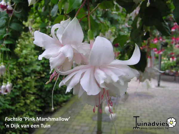 Fuchsia 'Pink Marshmallow' is een halfhangende bellenplant met dubbele bloemen.