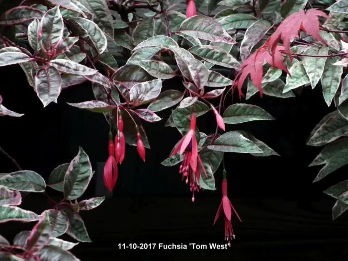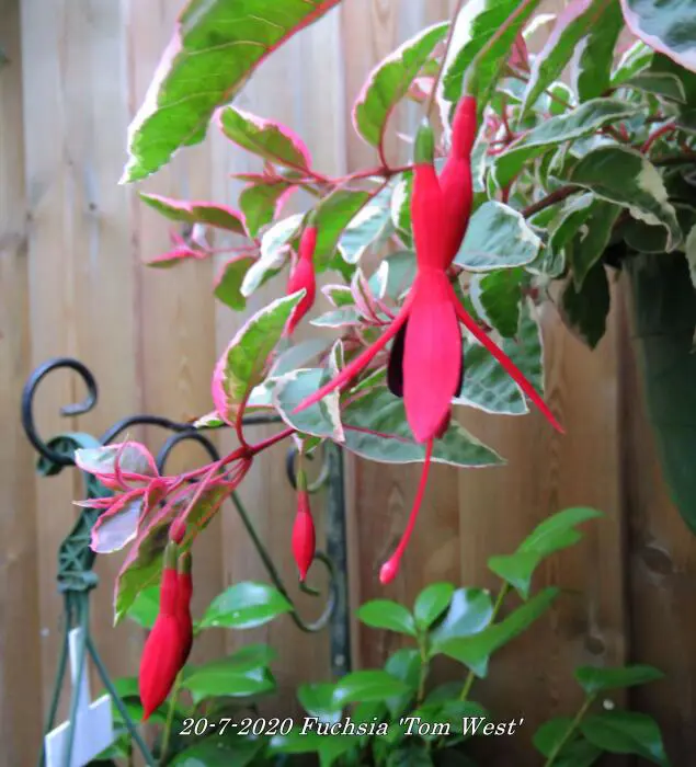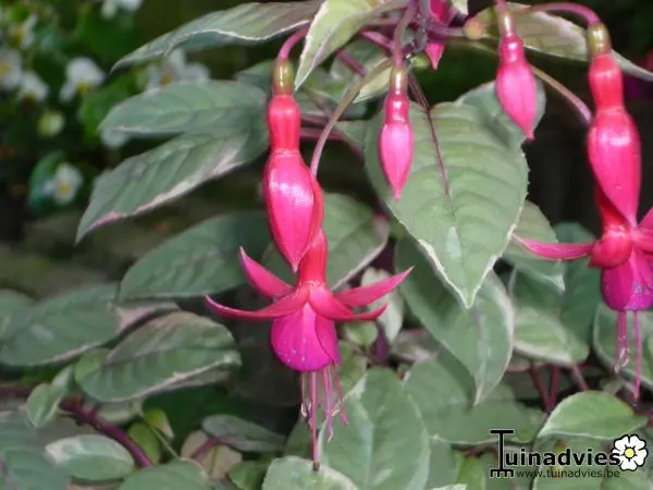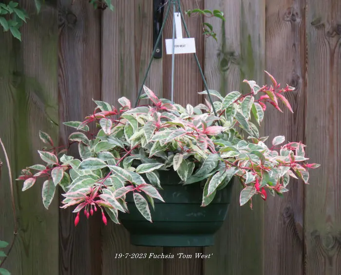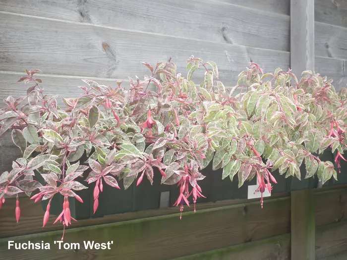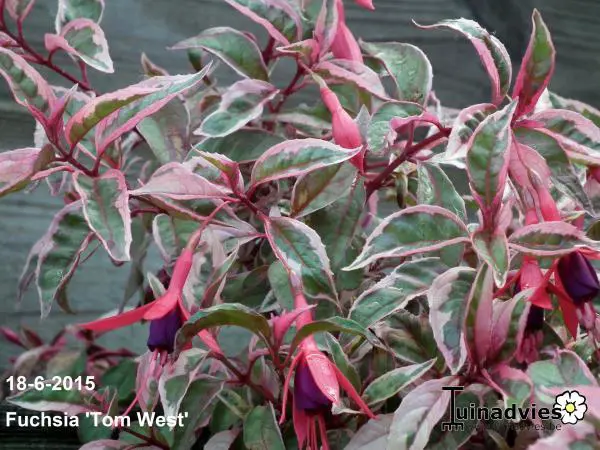 Fuchsia 'Tom West' is een opvallende Fuchsia met rood/bont blad.