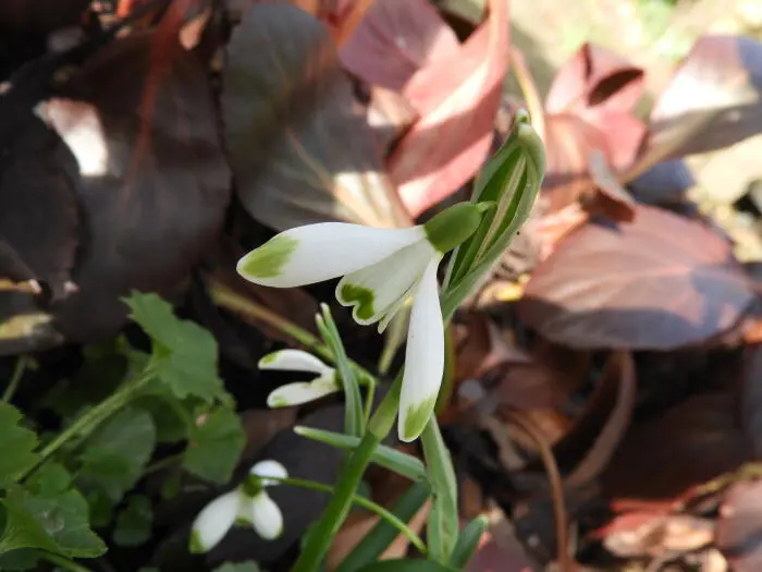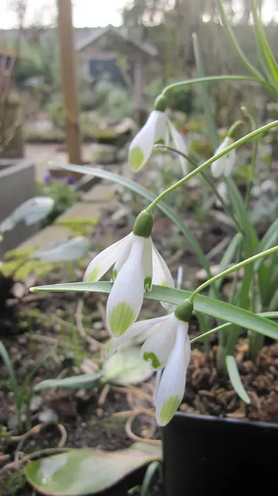 Galanthus nivalis 'Viridapice' bloeit helemaal wit met groene punten aan de bloemblaadjes.