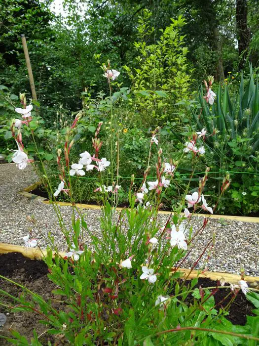 Gaura lindheimeri 'Gambit White' is een kortlevende compacte bossige plant met een lange bloeitijd van witte vlinderachtige bloemen uit roze knoppen. Bloeien op lange fijne stelen, wuivend in de wind.