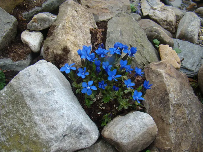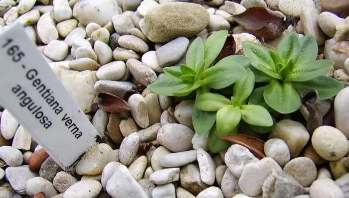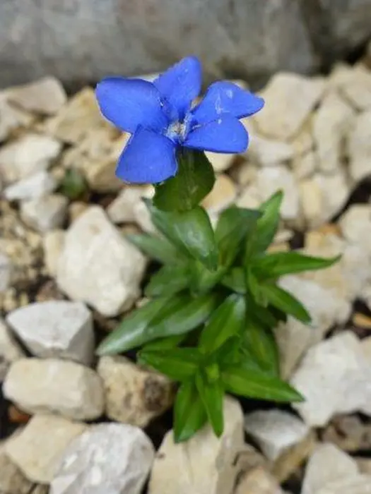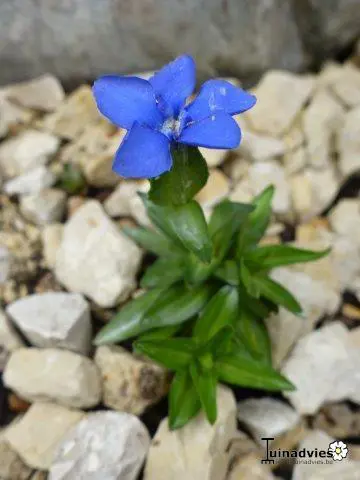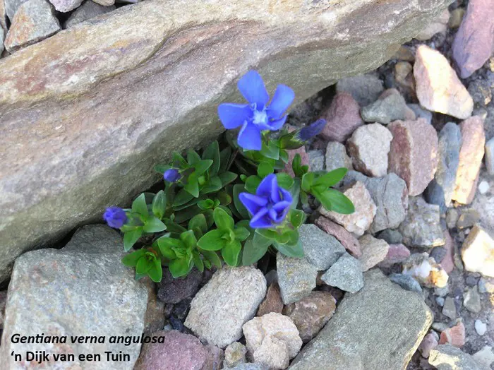 Gentiana verna 'Angulosa' is een compacte, matvormende plant met rozetten van smalle eivormige tot lancetvormige, donkergroene bladeren.