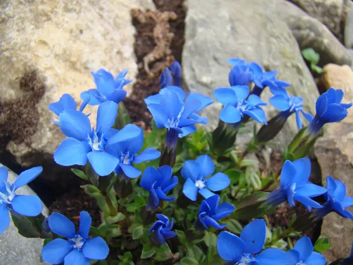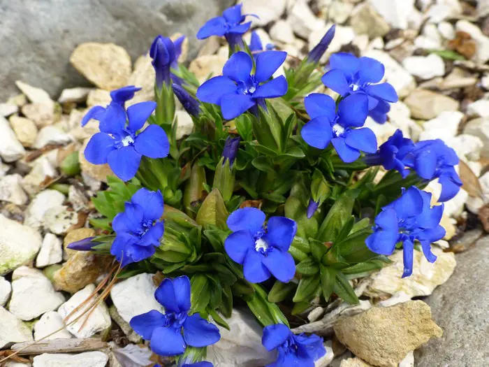 Aan korte steeltjes bloeien de stervormige, diepblauwe bloemen.