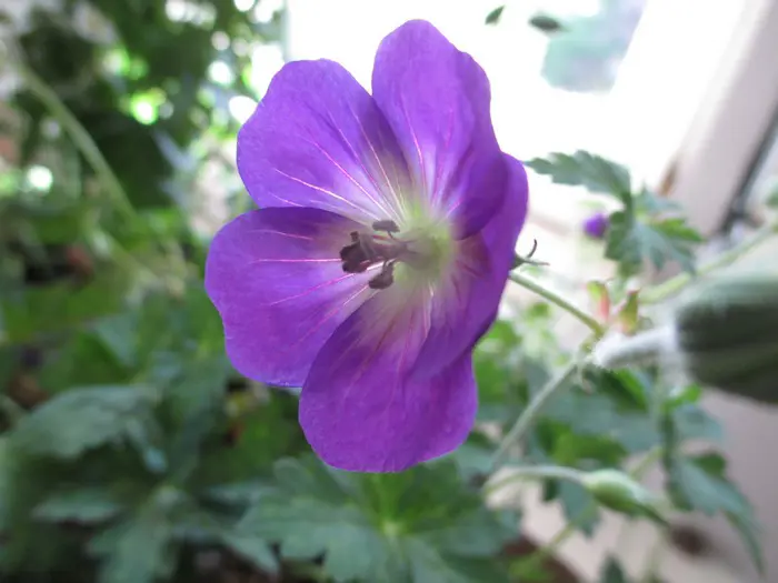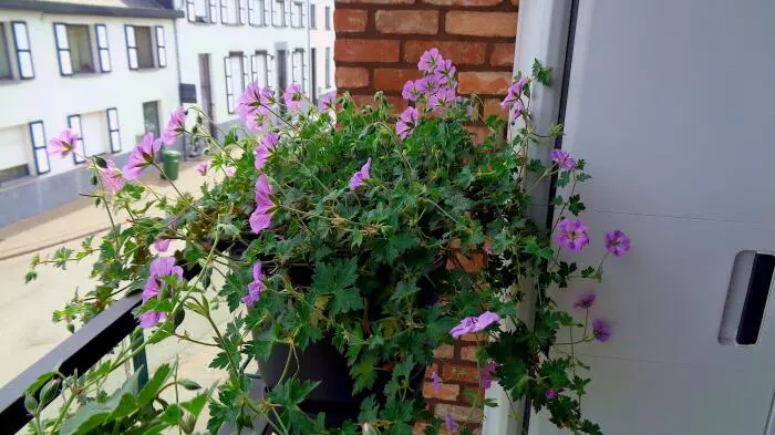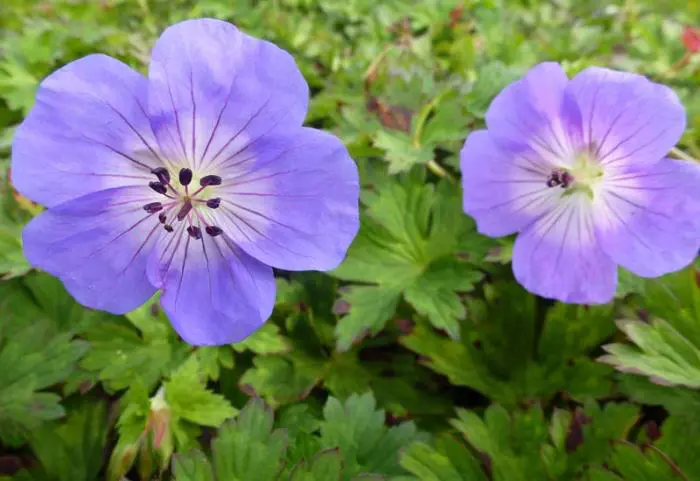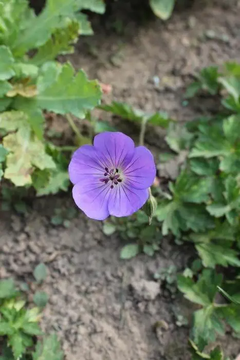 Geranium 'Azure Rush' is een hybride van Geranium' Rozanne' maar groeit wel compacter en dichter vertakt. Het blad is sterk ingesneden, groen met een lichte, paarse markering.