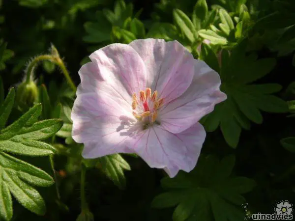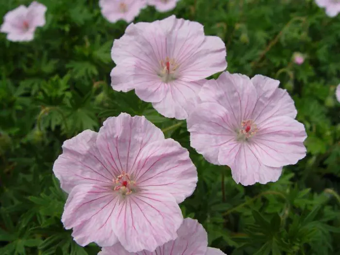 In de vroege zomer draagt de Geranium sanguineum var. striatum grote, paarsgeaderde, lichtroze bloemen. Bloeit van mei tot juli met een herbloei tot september.