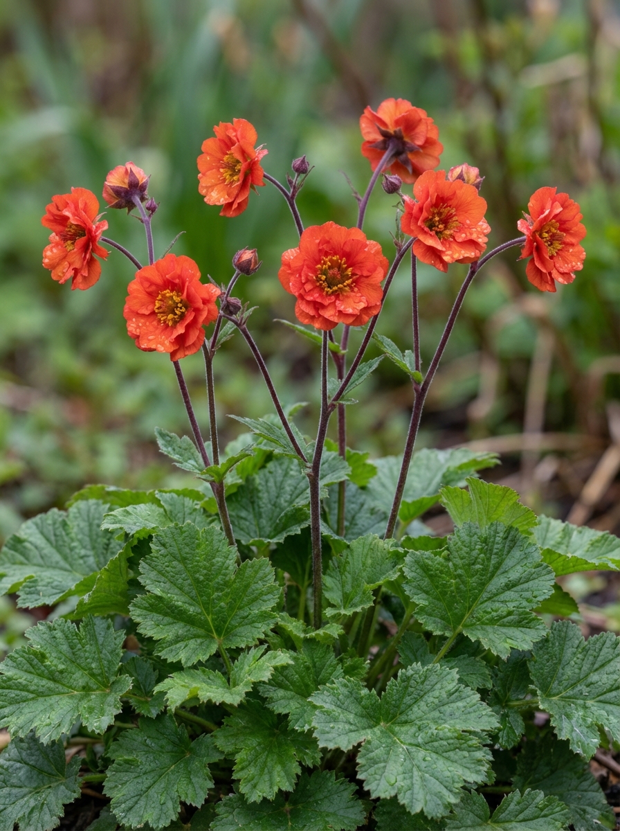Geum chiloense 'Mrs Bradshaw' bloeit met halfdubbele, scharlakenrode bloemen.