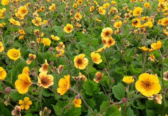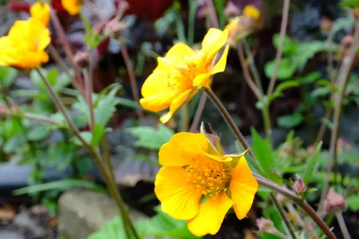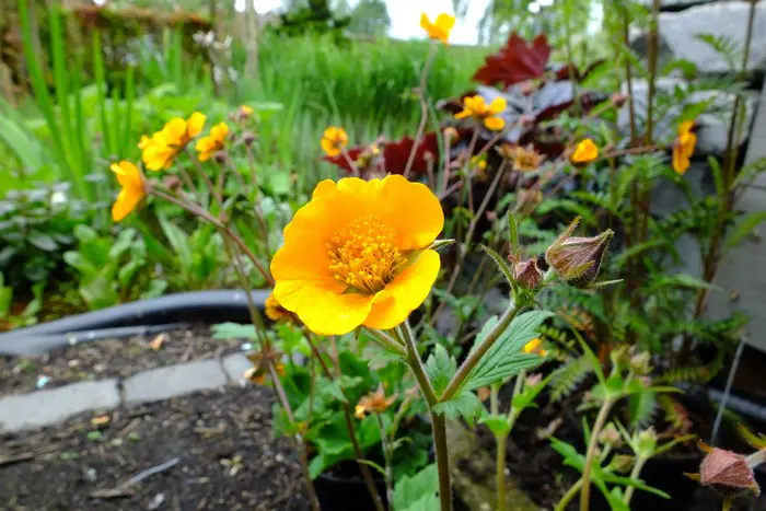 Geum 'Carlskaer' bloeit met komvormige oranjegele bloemen, donkerder in het centrum.