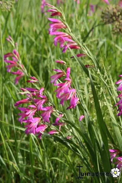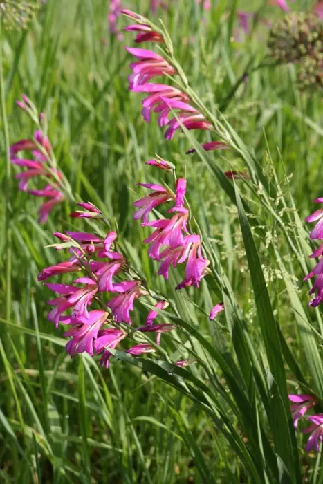 Gladiolus communis subsp. byzantinus heeft rechtopstaande zwaardvormige bladeren