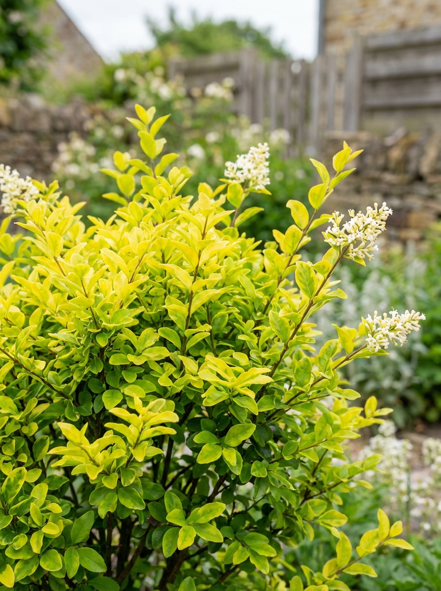 Ligustrum ovalifolium 'Lemon and Lime' bloeit met geurende witte bloempjes gevolgd door zwarte bessen tenzij ze als haag gesnoeid worden dan blijft de bloei uit.