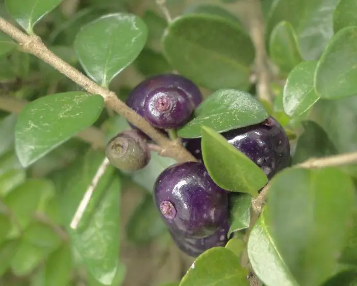Krijgt in mei/juni kleine witte bloempjes tenzij men het als een haagje snoeit dan blijft de bloei achterwege. Na de bloei, in de nazomer komen er blauwe besjes aan.