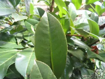 De bladeren zijn glanzend leerachtig licht tot donkergroen.