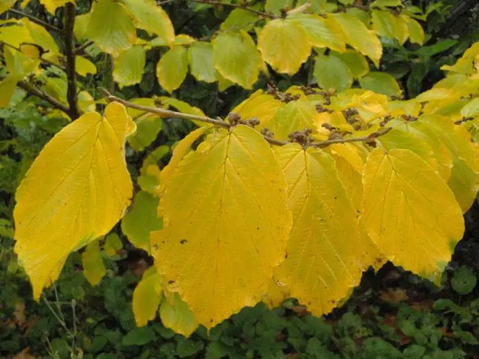 Ook het aantrekkelijk blad doet mee aan dit kleurrijk schouwspel door te verkleuren naar geel en rood.